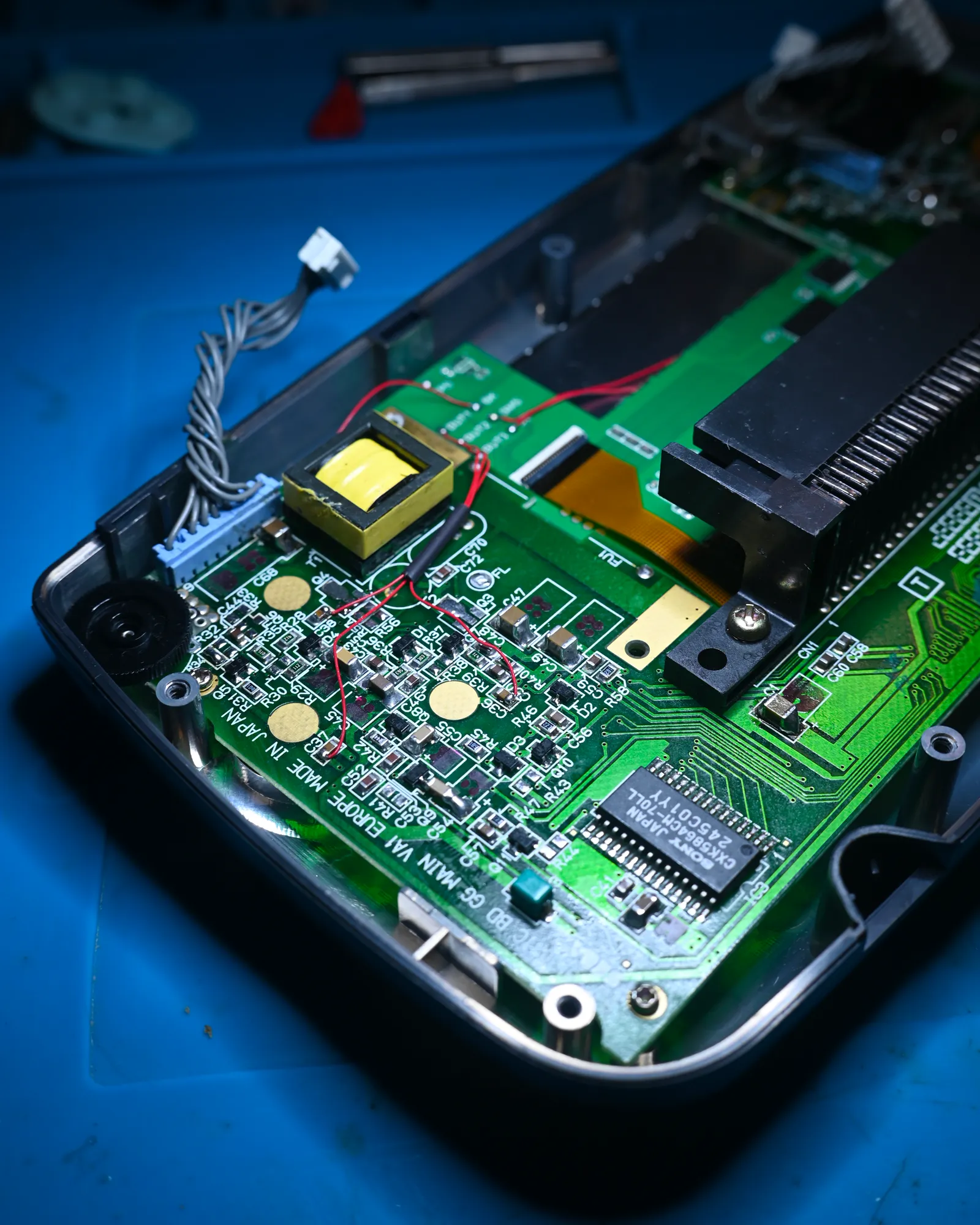 Dans les deux cas, la console est minutieusement restaurée : chaque composant est vérifié pour garantir un fonctionnement optimal. Un nettoyage de la carte mère est systématiquement réalisé pour restaurer les contacts, notamment ceux du port cartouche et des touches.